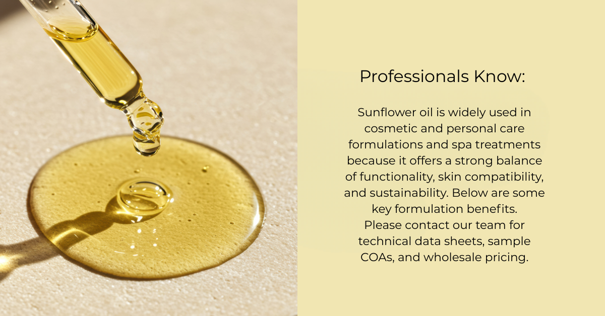 Sunflower Oil is one of the most versatile ingredients in the cosmetic industry: clean, safe, and ideal for a variety of natural product formulations. This lightweight, mild and non-comedogenic oil is rich in oleic fatty acid (Omega 9) and Vitamin E. It provides moisturizing, emollient and antioxidant benefits.